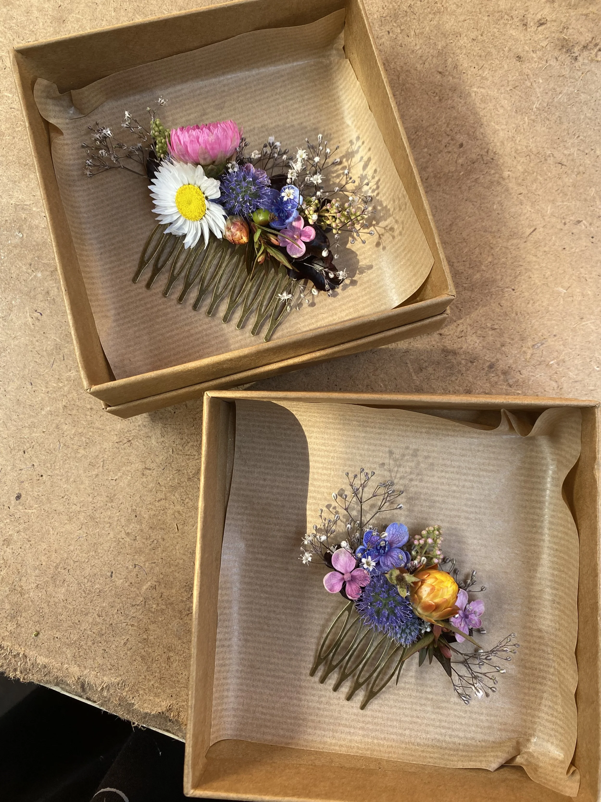 Pour agrémenter votre coiffure d’une petite touche fleurie, n’hésitez pas à penser au peigne fleuri ou aux épingles pour une touche plus légère.